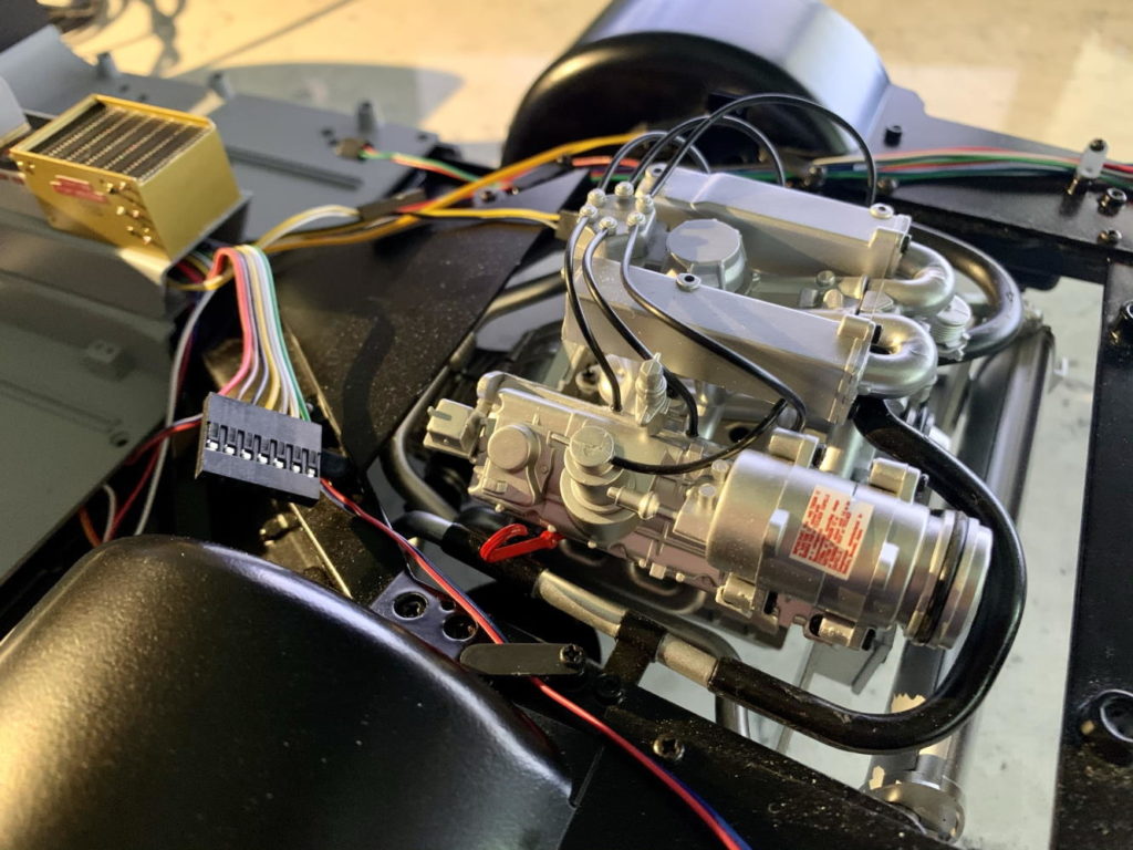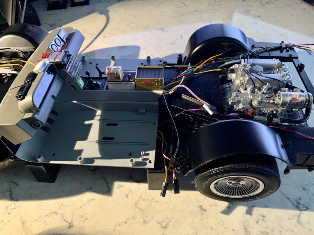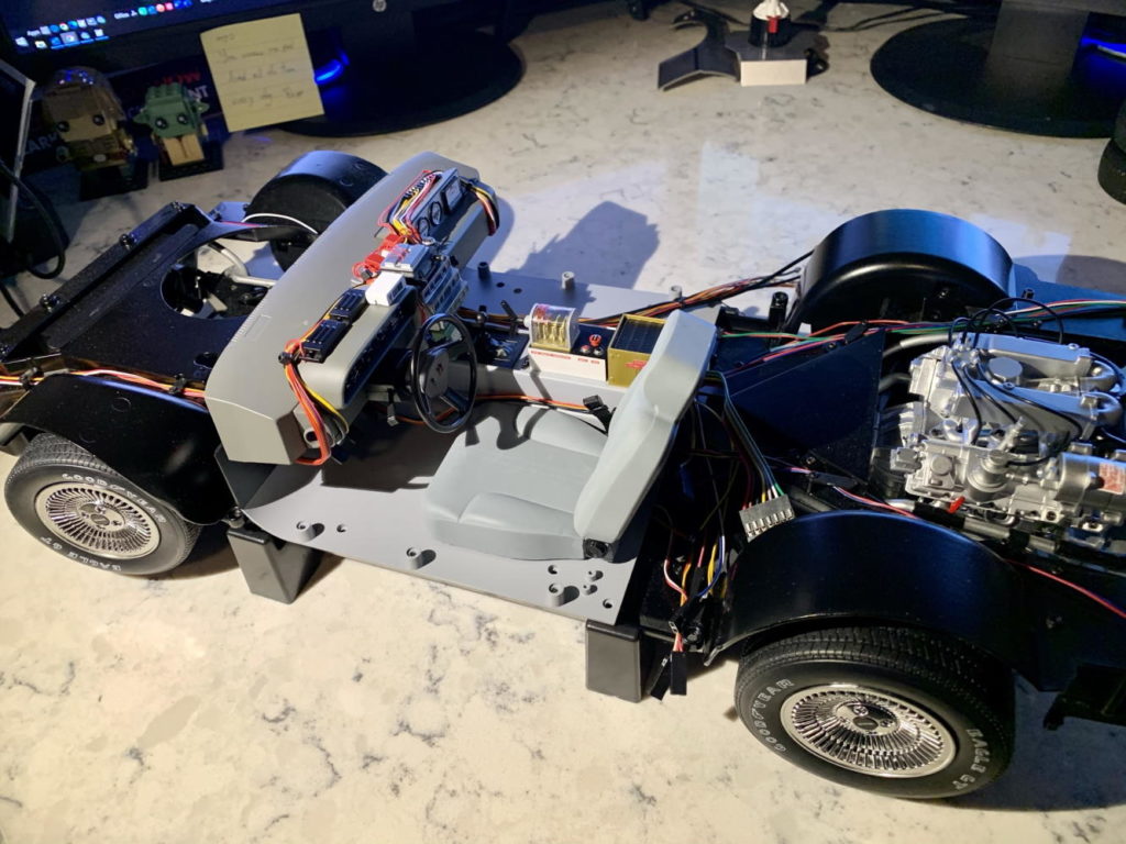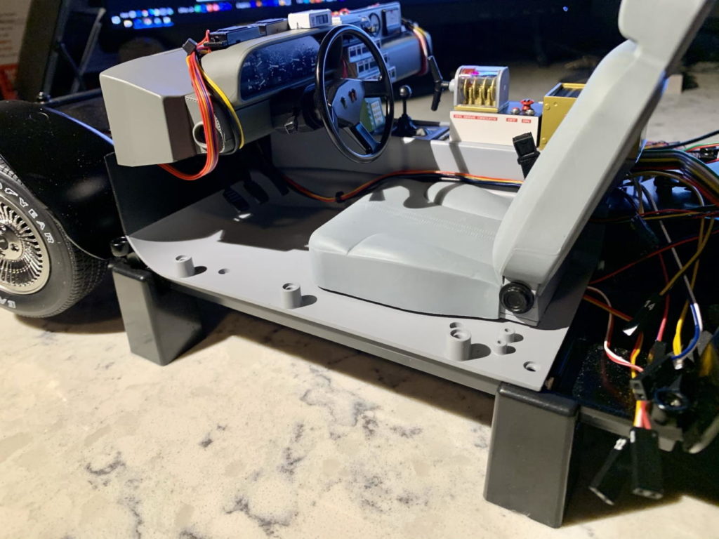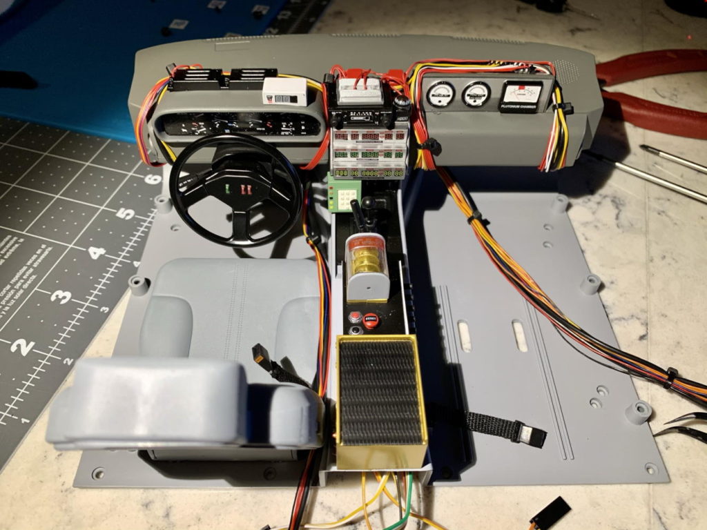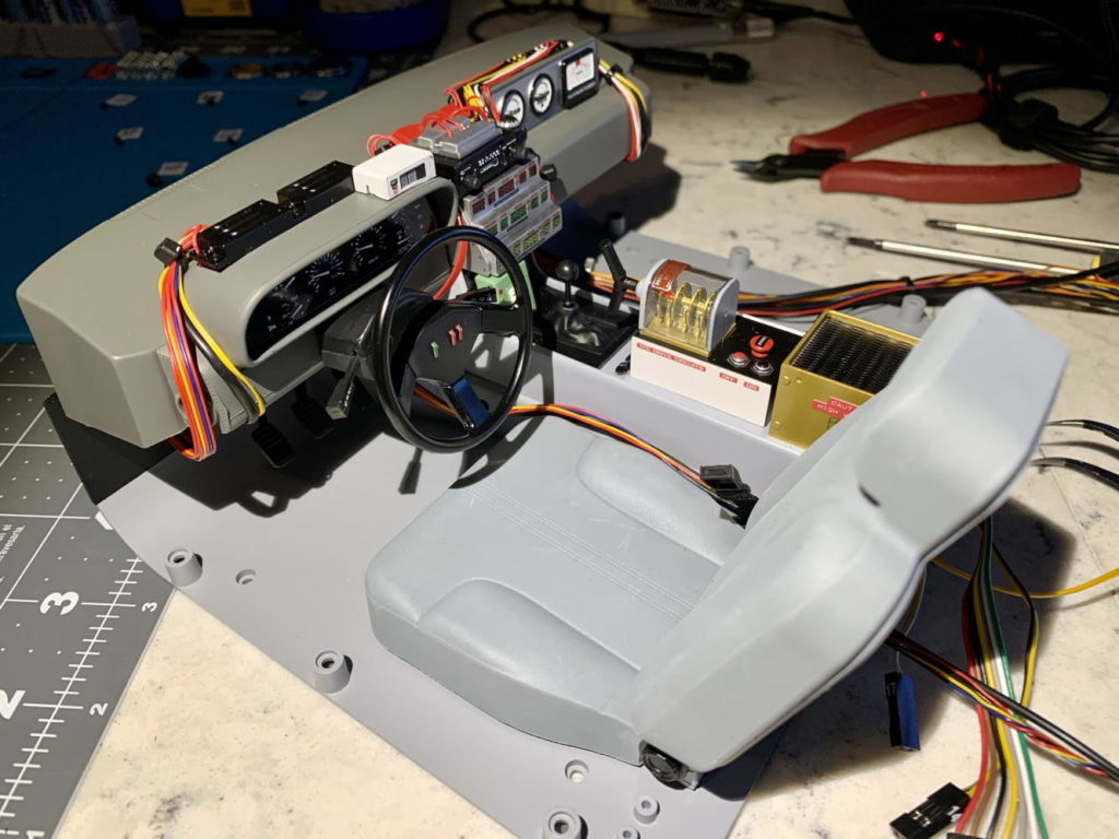 Driver’s seat and steering wheel installed. Also, tons of wiring installed, both functional and decorative.