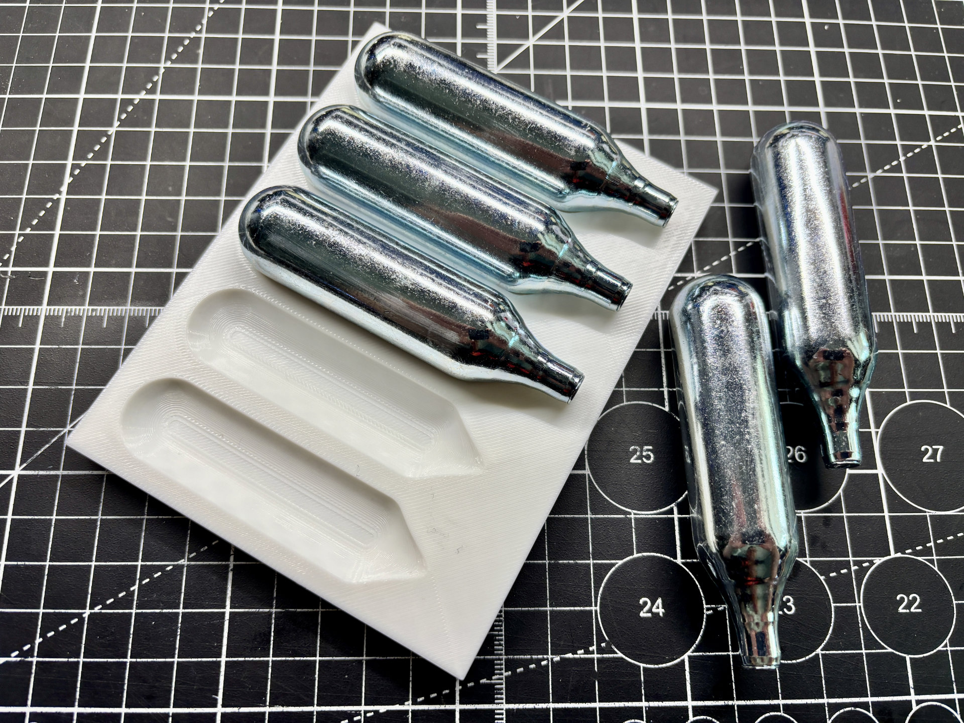 This is the finished look of the sandwich. To save on filament, the trays don’t fully envelope the CO2 cartridges. Instead, the bottom tray (with the posts) holds the top tray (with the finger hole) just above the cartridges. Hence, the “sandwich” analogy. Both trays were designed to snug up to the cartridges to prevent them from moving around.