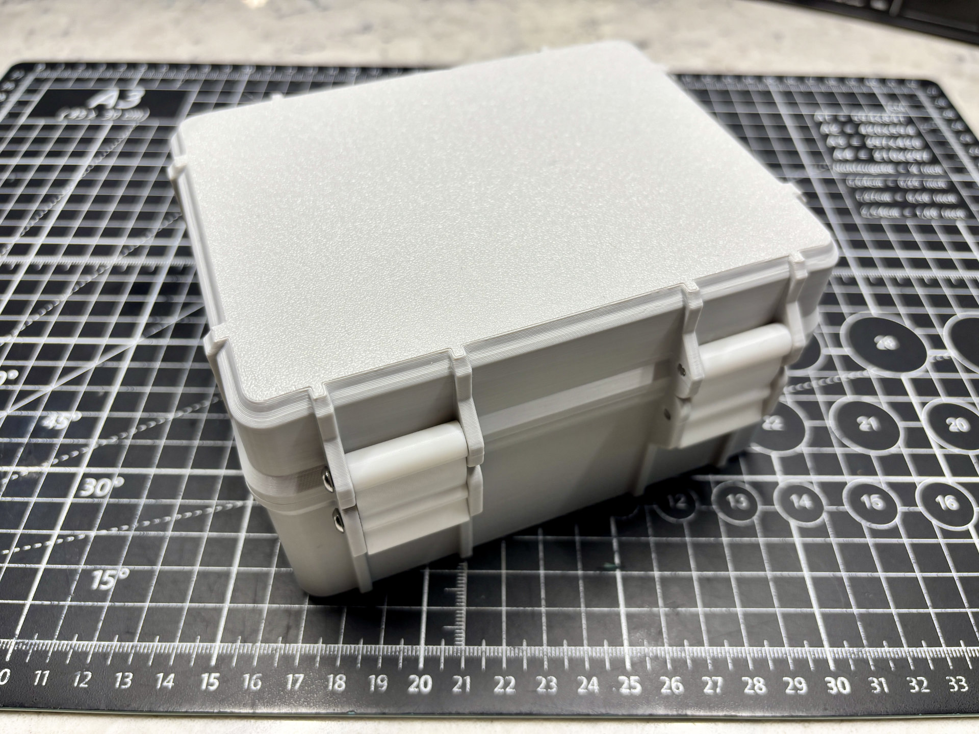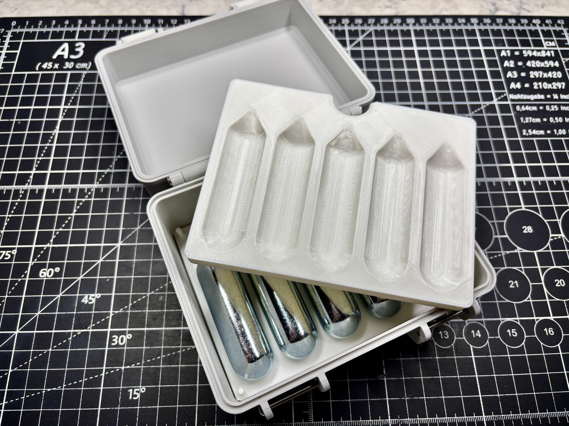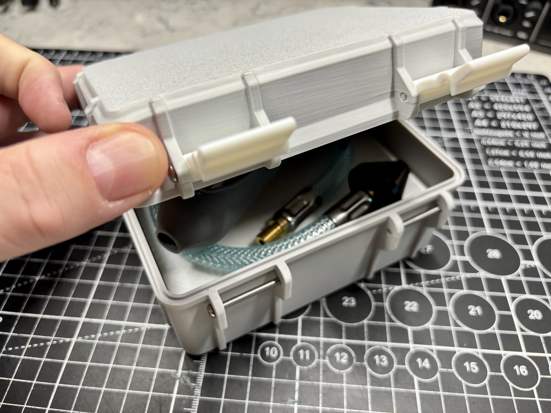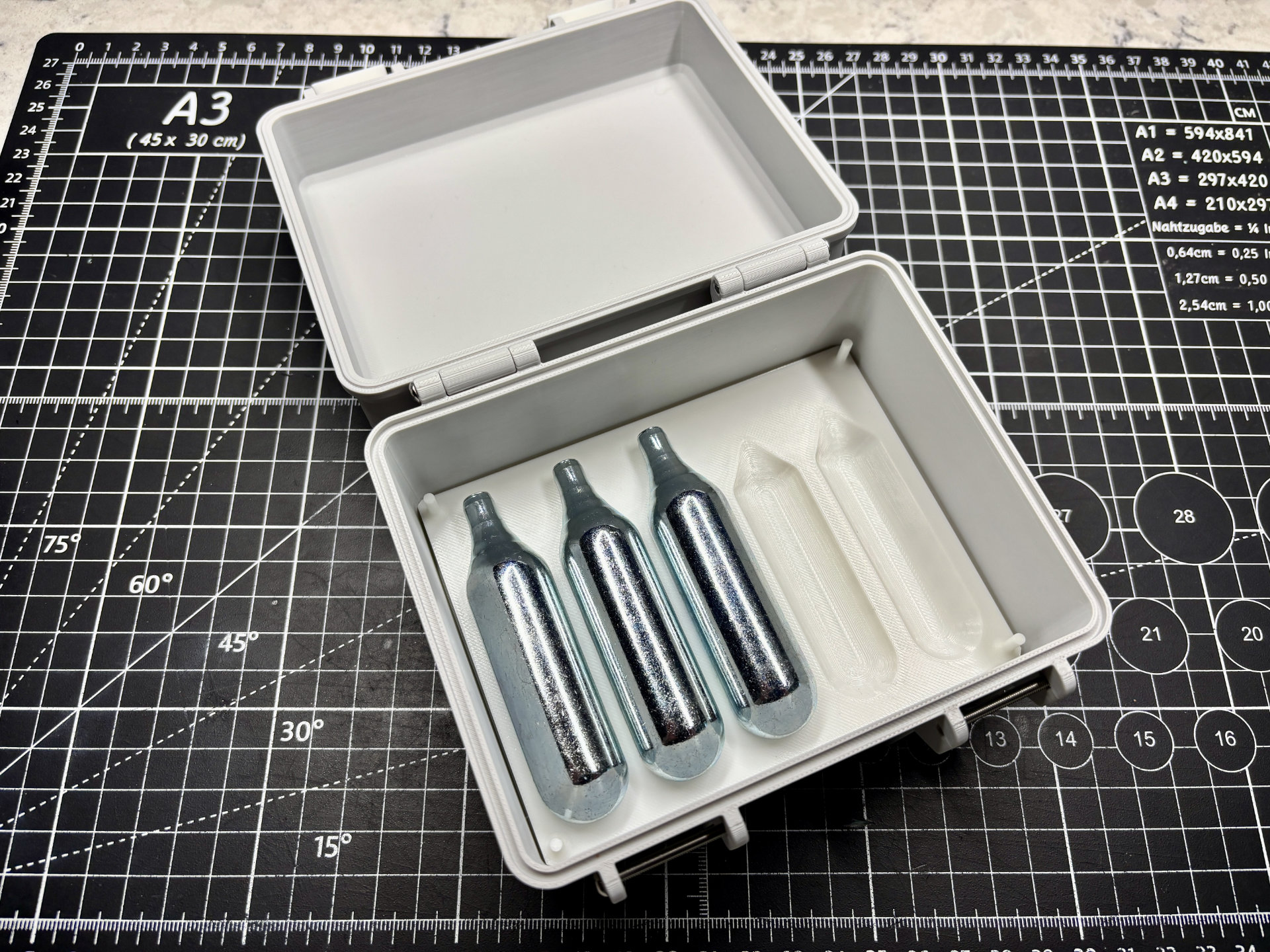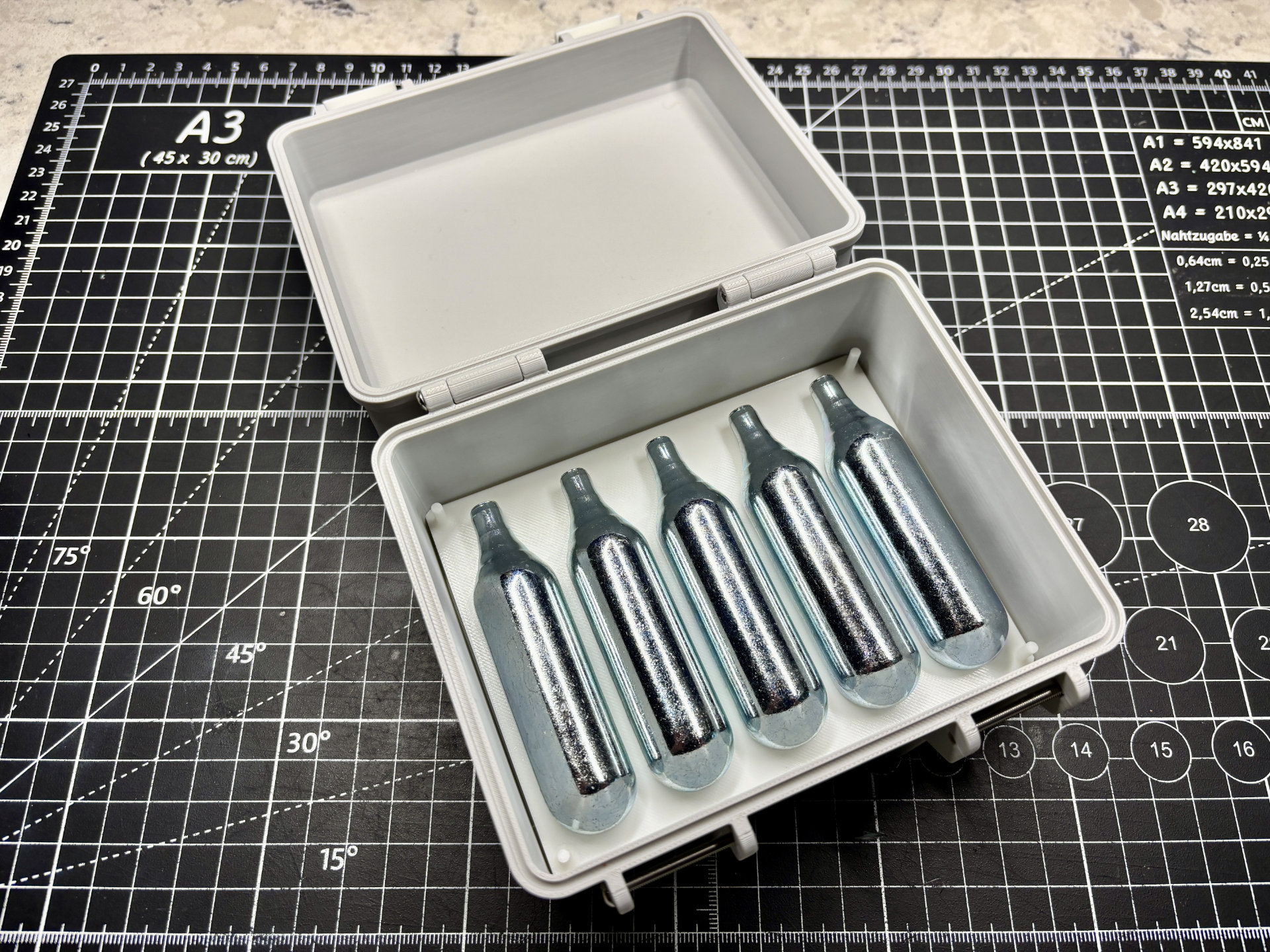 The storage box is based off a parametric Fusion model that I downloaded off the internet. This particular box was scaled to properly fit the CO2 gun components and internal printed trays. It was printed in Bambu Lab Light Gray PLA with Bambu Lab White PLA used for the latches and inner trays.