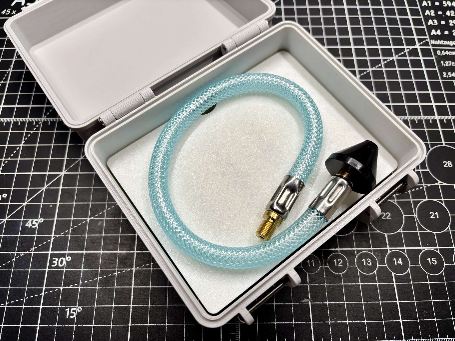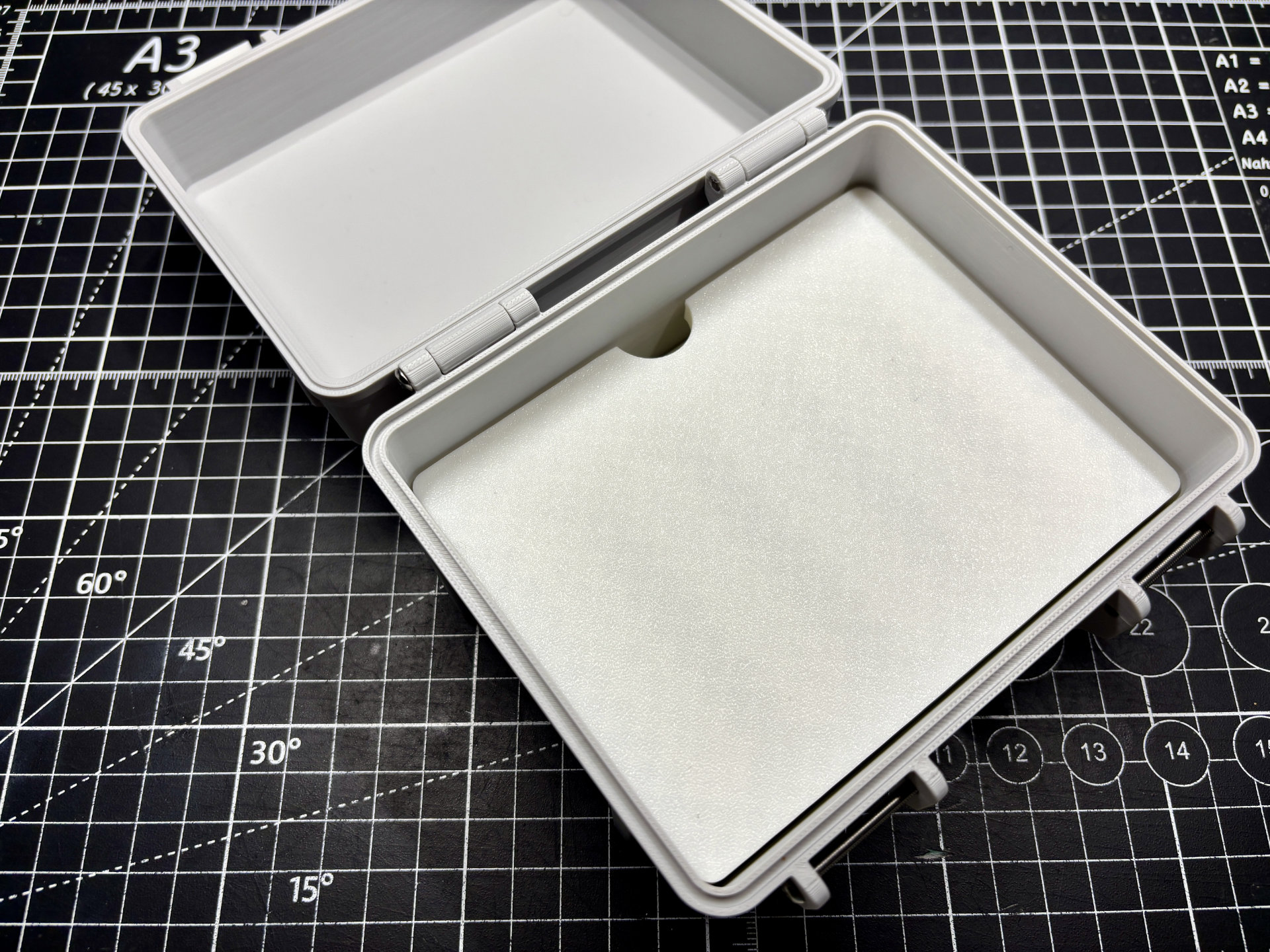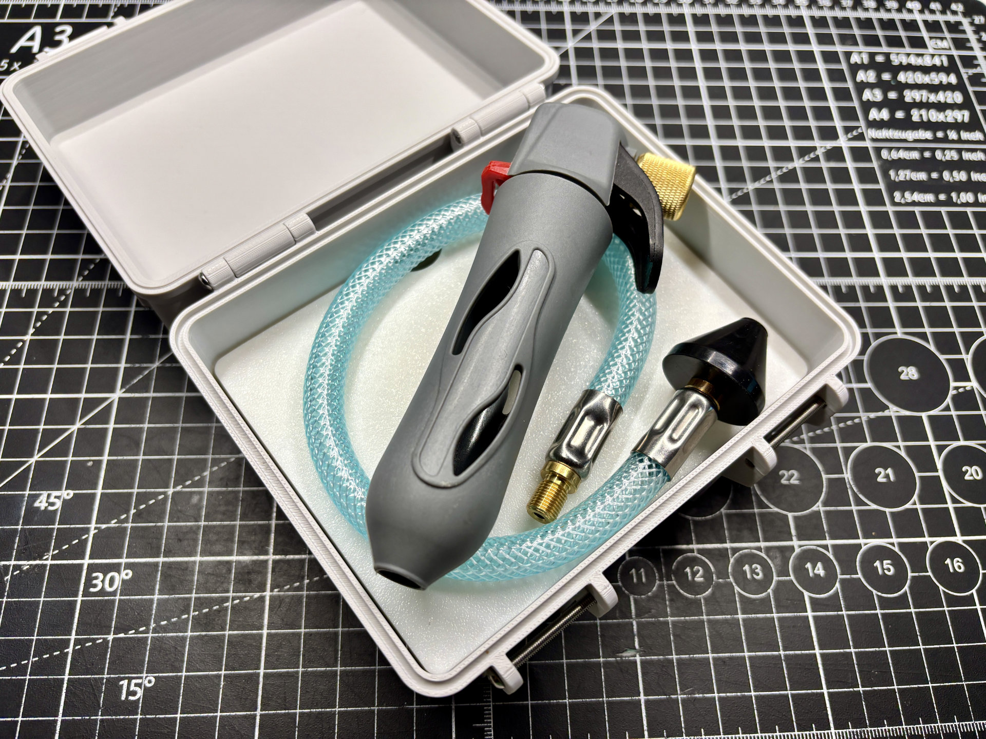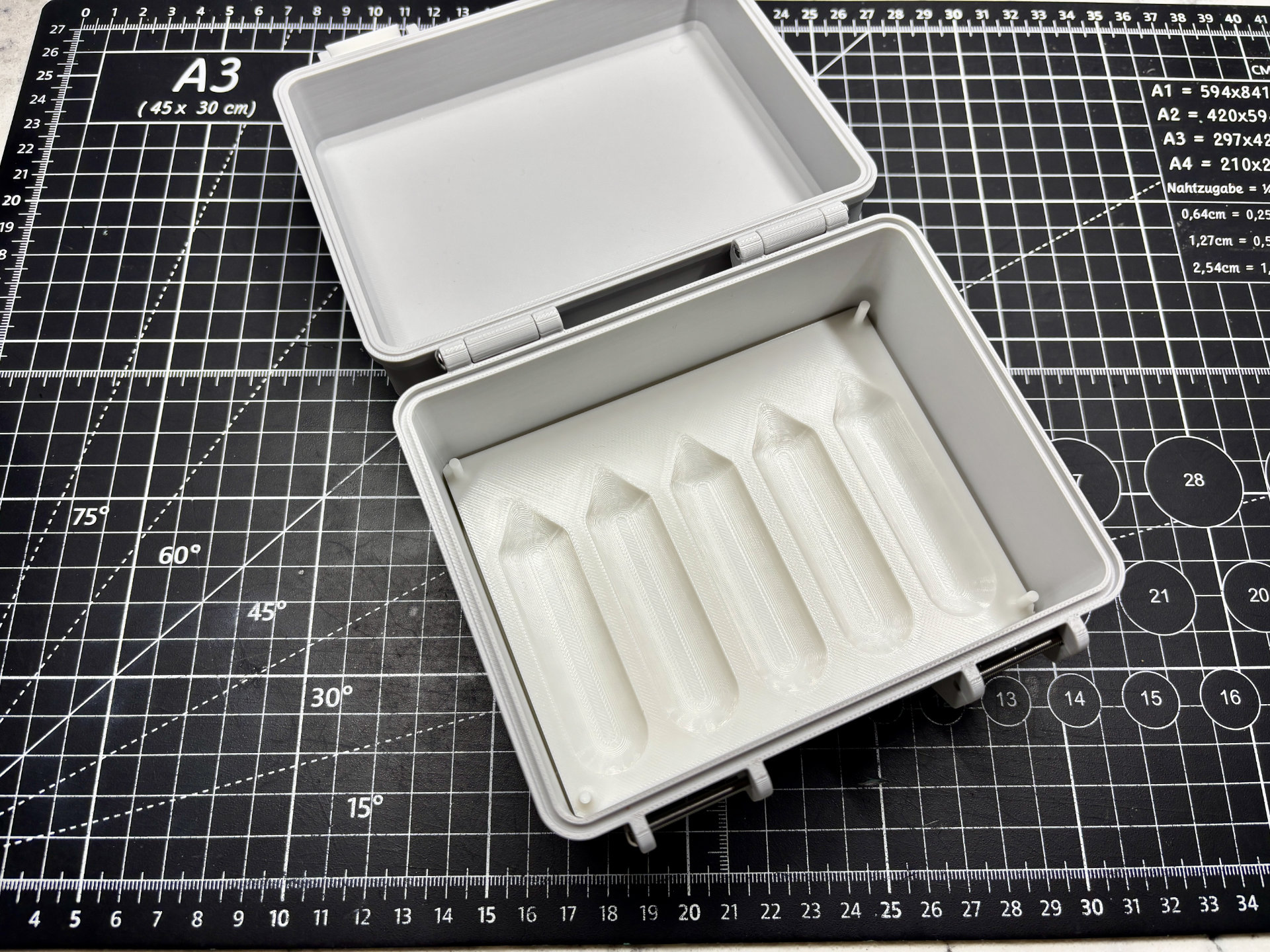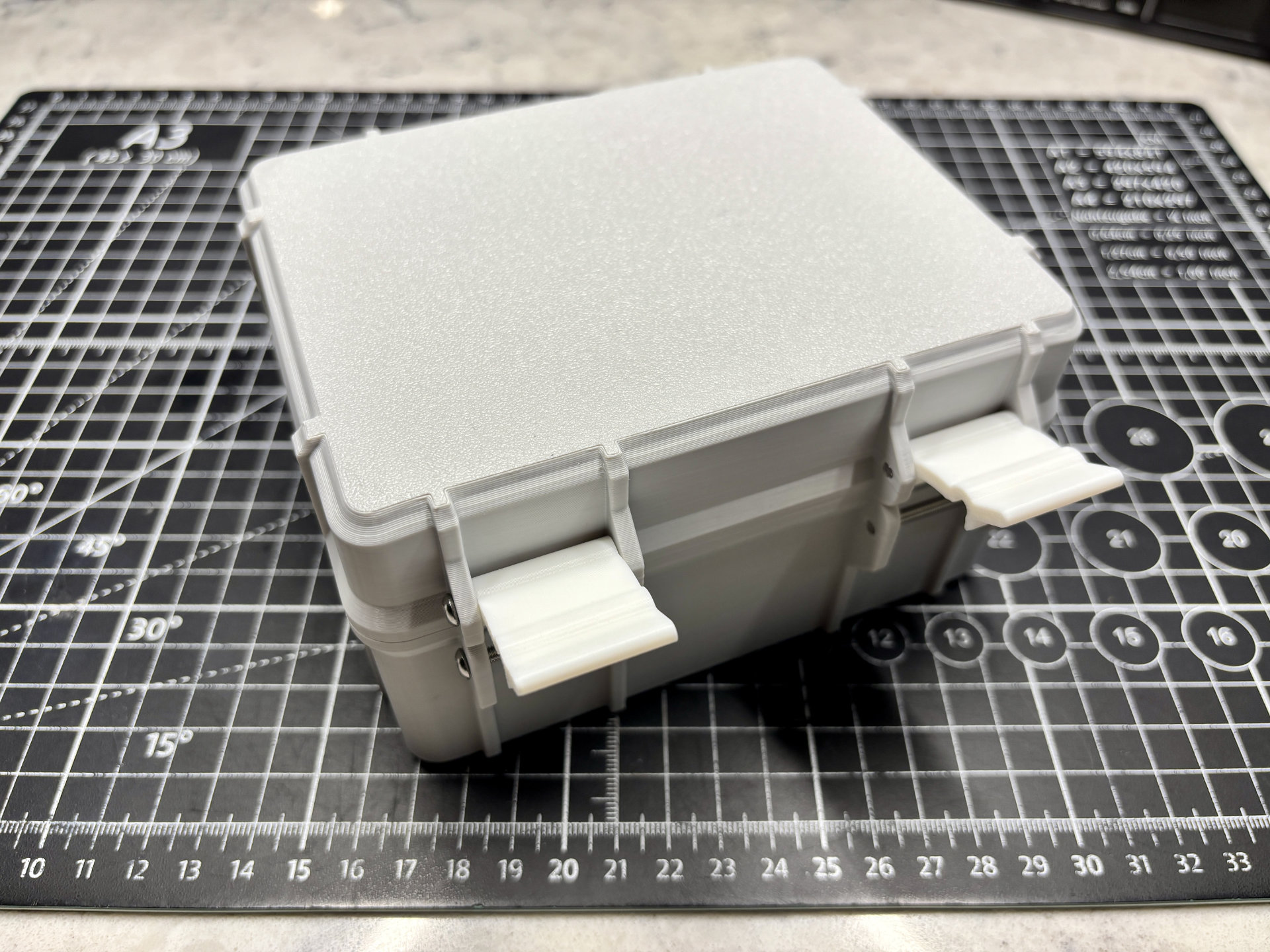 The storage box is based off a parametric Fusion model that I downloaded off the internet. This particular box was scaled to properly fit the CO2 gun components and internal printed trays. It was printed in Bambu Lab Light Gray PLA with Bambu Lab White PLA used for the latches and inner trays.