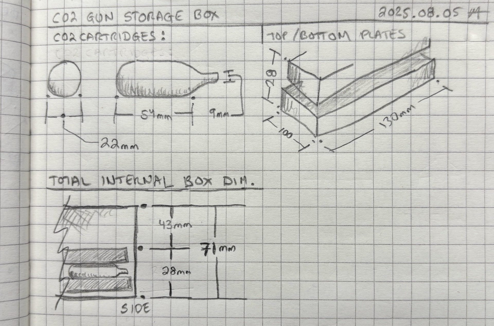 Finally, here are the design notes. The CO2 Gun Storage Box is now living out its life in the garage with all the other tools.